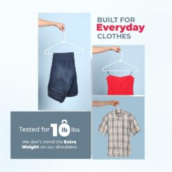 - DOUBLE BAR HOOKS – This adult plastic clothes hanger features hooks for clothing straps. Unlike weaker hooks, these hooks will not break easily given their top and bottom reinforcements. These slim closet non-slip hangers are essential.