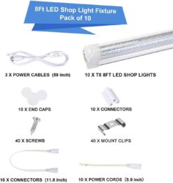 - 【8FT LED SHOP LIGHT SET】- 10 x T8 8′ led shop light, 10 x end caps, 10 x connectors, 40 x screws, 40 x mount clips, 10 x connector cables (11.8inch), 10 x power cords (5.9inch), and extra 3pcs power cables with on/off switch (59inch). The 8FT LED light bulbs perfect for garage, warehouse, storage area, workshop, basement, home, supermarkets, offices, convenience stores, gas stations, shops, hotels, etc.