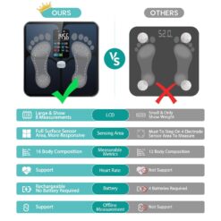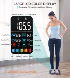 - 1.FSA & HSA Eligible/16 Essential Body Composition Analysis:Weight scale utilizes BIA to measure 16 body data include body weight,heart rate,BMI,muscle rate, body fat,subcutaneous fat,visceral fat,fat-free body weight,body water rate,skeletal muscle rate,muscle mass,bone mass,protein,BMR,heart index,body age.The data stored in the app help to know your body condition comprehensively.Besides,you can weigh yourself anytime without phone,the data will sync to the app once it’s connected again.