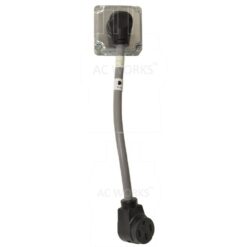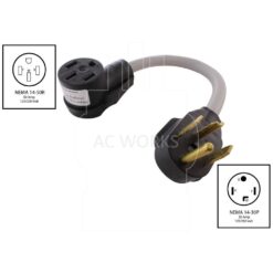 This AC WORKS brand adapter features a NEMA 14-30P connected to a NEMA 14-50R. The NEMA 14-30P, 30 Amp, 125/250 Volt, 4-prong dryer plug connects a NEMA 14-50R RV/EV/Range, 50 Amp connector. It is 1.5 feet in length and has an STW heavy-duty 10/4, 600-Volt jacket with a 30 Amp wire. The adapter features a heavy-duty molded durable adapter. The maximum power is 7500 Watts. For use with Telsa EV and is compatible with both Gen1 and Gen2 Mobile Connectors. This product includes a 5-year limited warranty.