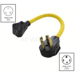 This AC WORKS brand RV adapter [RV1430TT-018] is 1.5-feet in length and is a NEMA 14-30P to NEMA TT-30R. The NEMA 14-30P is a 30 Amp, 125/250 Volt 4-prong dryer male plug. The NEMA TT-30R is a RV 30 Amp, 125 Volt female connector. This adapter has a maximum operating power of 3750 Watts and is backed by a 5-year limited warranty.