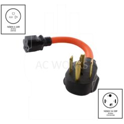 This AC WORKS brand dryer outlet adapter [S1430620-012] is very durable. It is a NEMA 14-30P to NEMA 6-20R. The NEMA 14-30P is a 30 Amp, 125/250 Volt, 4-prong dryer male plug. The NEMA 6-20R is a 15/20 Amp, 250 Volt, female connector. The cable is an STW, 10/3, 600 Volt jacket with a 30 Amp copper wire. The maximum operating power is 5000 Watts. Included in your purchase is a 5-year limited warranty.
