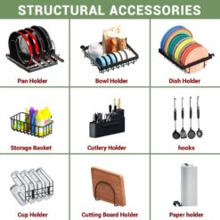 Package Includes: 1 x Dish Holder+ 1 x Bowl Holder+ 1 x Pan Honder+ 1 x Cutlery Holder +1x Chopping Board Rack+ 1 x Knife Holder + 5 x Hooks+ 1x Main Body+ 1x Cup Holder+ 1x paper holder