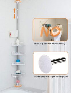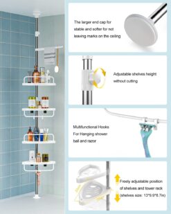 - 【Clean, Safe and Tidy】: The shower caddy contains 2 poles and 4 removable trays with patent drain design that doesn’t accumulate water and bacteria. It makes full use of the space in your bathroom, keeping your bathroom clean and tidy