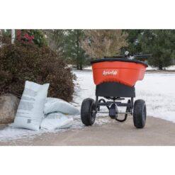 Tackle winter’s worst with the Agri-Fab, Inc. 130 lbs. Push Broadcast Spreader. Designed for ice control during the winter and lawn/garden maintenance during spring, summer and fall, the large 130 lbs. hopper capacity helps you finish any project quickly. It features large pneumatic tires for easy maneuverability and 25,000 sq. ft. coverage, roughly 1/2 acre, with professional alloy beveled gear for increased durability. The spreader includes a hopper cover, spreader grate and deflector, ideal for sidewalks. Stainless steel axle and spreader impeller for improved durability and easier cleanup.