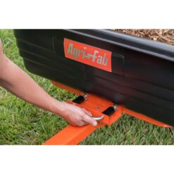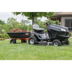 Take your mower to the next level with the Agri-Fab 700 lbs. load capacity tow poly dump cart. With large 15 in. x 6 in. pneumatic turf tread tires with powdered metal bearings this cart will easily roll wherever you want to go. Heavy-duty welded frame features 1 in. square tubing and has a 12 in. ground clearance to go over the roughest terrain. The heavy-duty channel tongue is equipped with an ergonomic latch system to easily dump the bed contents. A 110° swivel feature and 52° dump angle allows you to remove the cart contents exactly where you want them to be.
