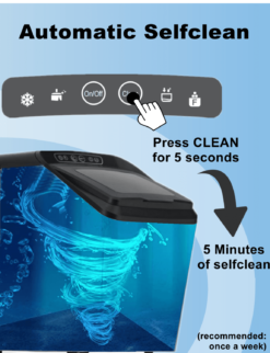 - Self-Cleaning Function: Press the CLEAN” button for 3s to start a 5min cleaning cycle to flush clean water through the system, and clean the ice bin with diluted detergent manually. Drain the water using the back-mounted drain tube. A clear double-layer viewing window holds the balance between monitoring ice status and isolating heat. Equipped with the most powerful and quiet compressor and DC fan, providing a faster cooling effect within 15 minutes, low consumption, and low noise level under 40dB.