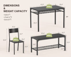 - 【Specifications】 Table size: Capacity: 250 lbs;Chairs size: Capacity: 300 lbs. Bench size: Capacity: 400 lbs; Package include: 1*table, 2*chairs, 1*bench.