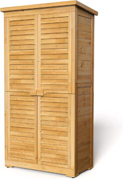 - The outdoor vertical storage cabinet with a wooden latch keeps all your garden tools secure