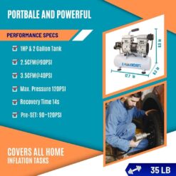 - Ultra-Quiet Airflow Operation – The best air compressor for working in residential or commercial areas, our small air compressor only produces 60dB which means you can run inside the house, in a workshop, or on a jobsite without interrupting others.