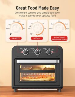 - Convenient, Open Design: Air frying is now easier than ever with three easy-turning knobs to set the temperature, timer and cooking functions; the open transparent glass lid enables you keep an eye on your fried meal instead of frequently opening the cover and losing heat
