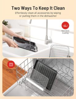 - No Mess, No Fuss Cleaning: With its non-stick coating, no food residue is left behind. This means it’s never been easier to keep the air fryer and its accessories clean – all you need is a dishwasher or simply a sponge to wipe it clean