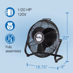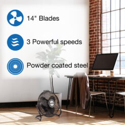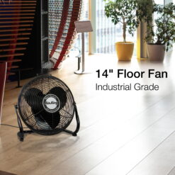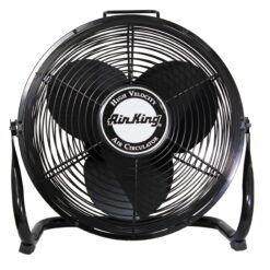 The Air King 9214 14-Inch Industrial Grade High Velocity Pivoting Floor Fan is ideal for use in offices, stores, garages, warehouses and any other industrial or commercial space that needs powerful air circulation. The 14-inch, 3-blade fan is constructed of powder-coated steel for long-lasting durability. The fan has three speeds with a rotary switch on the back of the unit and a pivoting head for directional airflow. The single phase 1/20-horsepower, fully enclosed, permanently lubricated ball bearing motor with a split capacitor provides powerful and effective air movement. Rubber feet reduce vibration and ensure the fan will not move. The 9214 floor fan is ETL listed, OSHA compliant and features a 1-year limited warranty.