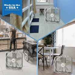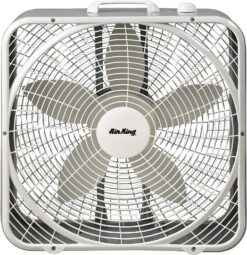 The Air King 9723 20-Inch 3-Speed Box Fan is strong, and efficient. A top rotary switch easily switches among its 3 speeds. Thanks to a 1/25 HP, permanently lubricated motor, this commercial box fan is quiet and powerful. Chemical-resistant blades are made of polypropylene, and they’re protected by impact-resistant plastic grills on the front and back.