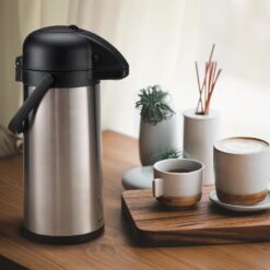 - DISPENSES EASILY AND QUICKLY – with the pump-action top. Just press down on the button at top and the beverage pours out. You can fill up to 15 coffee cups with one simple press for each.