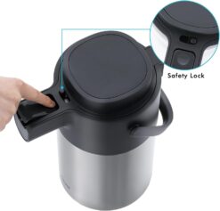 - Sleek Design and Sturdy Construction: Made from high-quality 18/8 stainless steel interior and exterior, this stylish airpot coffee dispenser with pump is sturdy and well insulated. With the sleek and modern look, the hot drink dispenser is a must-have addition to your coffee setup. It also features a safety lock that helps prevent drips and overflow.