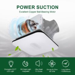 - 3CCT LED light with night light – the bathroom vent fan with light can be customized your experience by choosing the color temperature in 3 options (2700K, 4000K, 5500K) and the 5-Watt 2700K night light will help you to find your way through the room in the darkness