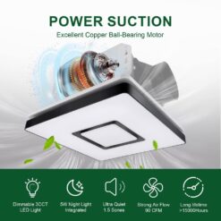 - 3CCT LED light with night light – the bathroom vent fan with light can be customized your experience by choosing the color temperature in 3 options (2700K, 4000K, 5500K) and the 5-Watt 2700K night light will help you to find your way through the room in the darkness