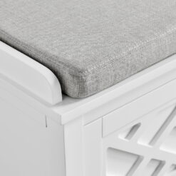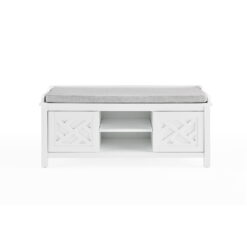 - Versatile, 45″W bench with cushion adds a decorative and functional storage piece to your entryway, mudroom or laundry room