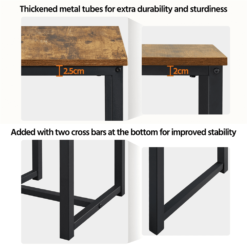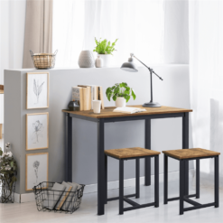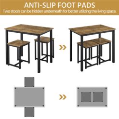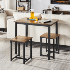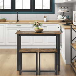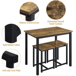This rectangular 3-piece dining set could be the perfect space-saving solution for any kitchen, dining room, foyer, or den. The set is made of premium engineered wood and a solid iron frame, Featuring a rectangular shape, this kitchen table set could perfectly fit into any narrow space. It can be used as an island for meal prep, a simple dining table for two people, or a table&chair set for study or work.Two backless stools could be hidden underneath for better utilizing the living space. And you can sit in any direction, and the footrest at the base provides extra comfort while seated. This set has a warm, industrial style, but the sleek and clean lines give it a modern look as well. This 3-piece dining set perfectly combines practical use and a stylish look. Each set includes 1 table and 2 stools, which is great for the dining room, kitchen, living room, bar, home office, apartment, etc.
