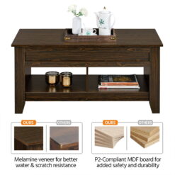 This lift top coffee table a chic and practical addition whose tabletop can be easily adjusted to a suitable and comfortable height to use a laptop, write or dine while sitting on the couch. Under the tabletop hides a large storage space for keeping daily used items handy and clean. Two partitioned lower shelves can house baskets of toys or showcase some decorative favorites. Crafted of waterproof covering, and heavy-duty metal hardware, our coffee table with the ability to hold up to 55kg/121.3lb in total is strong and sturdy for your everyday use.