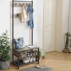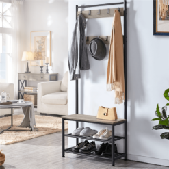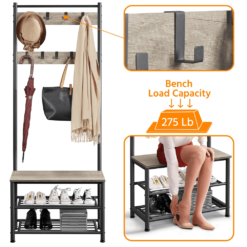 Constructed of baking finished metal and CARB P2-compliant manufactured wood, the hall tree has a good performance on strength, durability, and rust resistance. The 3-in-1 multifunctional hall tree provides you with 9 movable hooks, 2 additional open shelves, and 1 shoe changing bench that can hold up to 125kg/275lb. A practical addition to the entryway, hall, foyer, mudroom and bedroom.