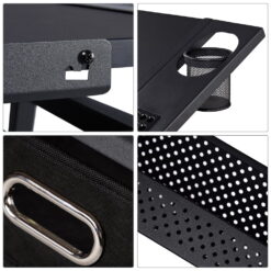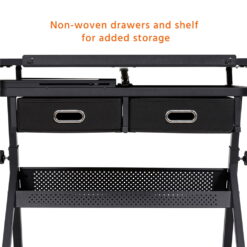 This drawing table has all you need for art and office supply storage. There is a detachable table top that is easy to clean with separate storage slots for stationery. There are two simple and practical non-woven fabric drawers. We have also included an extra metal shelf down below for your drafts or paint cans. The artist table can be tilted at an angle range of 0 to 60 degrees. It can work as a regular flat table for your laptop tasks or a professional drafting table for your art interests. The adjustment system makes it easy for you to control the angle at your will. The drawing board has an adjustable metal pencil ledge attached to the front edge to keep your drawing instruments from sliding or rolling off at a tilted angle. A special adjustment fitting design for you to lock and loosen the pencil ledge with ease. No need to purchase an office chair or stool! We have included one with your purchase.