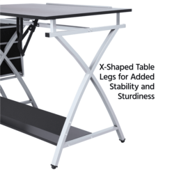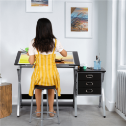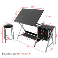 This drawing table has all you need for art and office supply storage. There is an adjustable table top that is easy to clean with separate storage slots for stationery. There are two simple and practical fabric storage drawers. We have also included an extra metal shelf down below for your drafts or paint cans. The artist table can work as a regular flat table for your laptop tasks or a professional drafting table for your art interests. The adjustment system makes it easy for you to control the angle at your will. The drawing board has an adjustable metal pencil ledge attached to the front edge to keep your drawing instruments from sliding or rolling off at a tilted angle. A special adjustment fitting design for you to lock and loosen the pencil ledge with ease. No need to purchase an office chair or stool! We have included one with your purchase.