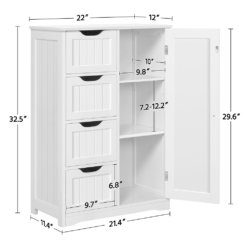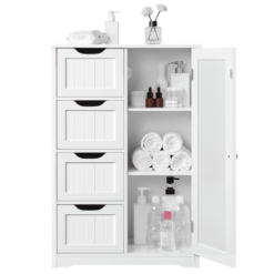 - GREAT ORGANIZER:Â 4 Drawers on the left and one cupboard on the right for you to organize different items like cosmetics, toiletries, towels, toilet paper, etc.
