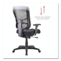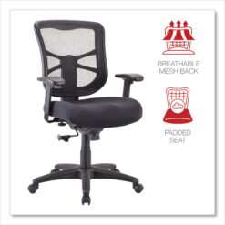 Alera’s ergonomic design adjusts to fit multiple users. Cool, breathable mesh back. Contoured seat cushion with waterfall edge to help relieve pressure on legs. Height- and width-adjustable arms with soft polyurethane pads. Five-star base with casters for easy mobility.