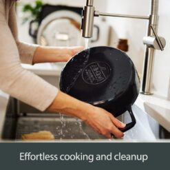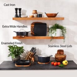 - Built to Last-Cast Iron heats steady and evenly featuring a glossy enamel exterior combined with a black matte enamel interior that requires no pre-seasoning. The durable enameled interior and exterior while not nonstick is scratch and stain resistant