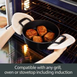 - Cast Iron is oven safe up to 650°F and compatible with all cooktops, including induction and outdoor grills. Handwashing is recommended. To preserve the enamel coating, we recommend using silicone, nylon, or wooden utensils. Limited Lifetime Warranty