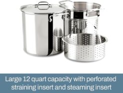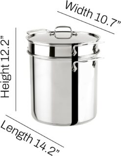The All-Clad 12-quart Stainless Steel Multi-Pot offers exceptional versatility & durability to prepare a wide range of meals. The large pot works well for canning, blanching, or making large batches of soups and stews, while the perforated inserts allow for convenient preparation of homemade stocks or pasta. And the steaming insert is perfect for delicate foods like vegetables or seafood. Prominent side handles ensure a secure hold when transporting the pot from the sink to the stovetop or when lifting the insert. Combining high-quality craftsmanship and long-lasting performance, All-Clad’s Gourmet Accessories cookware offers a sleek polished exterior, warp-resistant strength, compatibility with all stovetops (including induction) — perfect for everyday cooking and holiday entertaining alike.