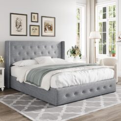 Allewie Full Size Lift Up Storage Bed, Button Tufted Headboard with Wingback, No Box Spring Needed, Hydraulic Storage, Light Grey