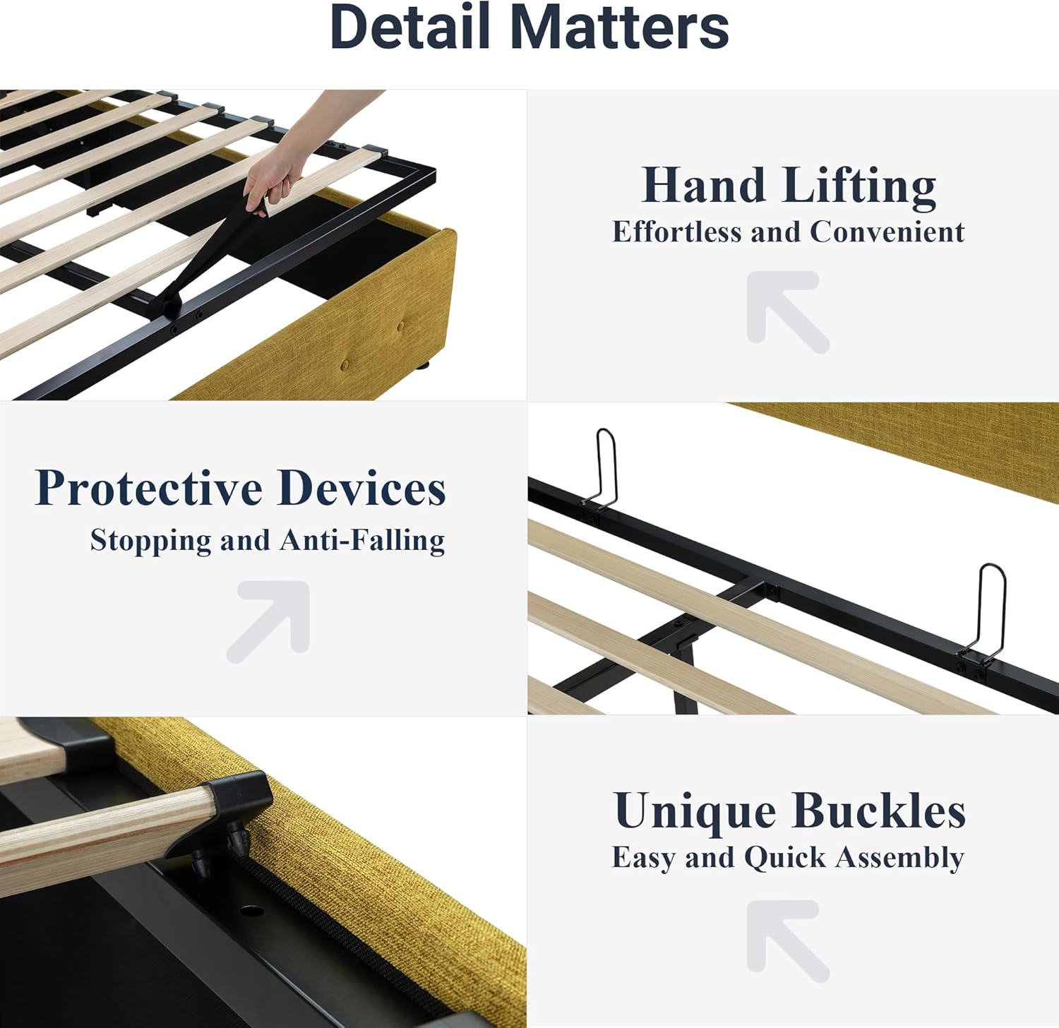 - Space-Saving Storage: With its lifting up storage feature, this bed frame provides ample space to store extra bedding, clothing, shoes, and other items, especially helpful for smaller bedrooms or apartments where storage space is limited