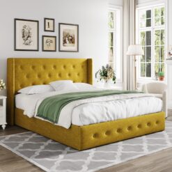 Allewie Full Size Lift Up Storage Bed, Button Tufted Headboard with Wingback, No Box Spring Needed, Hydraulic Storage, Olive Yellow