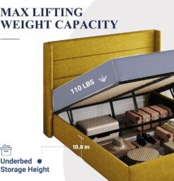 Allewie Queen Size Lift Up Storage Bed, Modern Wingback Headboard, No Box Spring Needed, Hydraulic Storage, Olive Yellow
