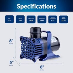 - EASY MAINTENANCE AND IDEAL SIZE: Includes a large pre-filter for easy disassembly and ease of replacement, and pump measures 8″L x 5″ W x 6″H for use in ponds up to 33′ wide