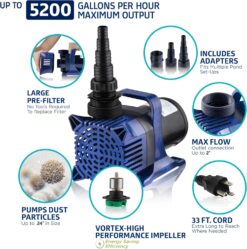 - PROFESSIONAL POND WATER PUMP: The Alpine 5200 GPH Submersible Water Pump ensures continuous water circulation in ponds, fountains, and waterfalls. It works submerged or on land, keeping your water features healthy year round.