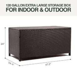 120 Gal. large-capacity outdoor storage with exterior dimension 47.2 in. L x 24.4 in. W x 24 in. H. Quickly assemble Resin Deck Box with no tools needed. Rattan deck box is built with all-weather resistant polypropylene with a stylish finish. Outdoor storage bench is perfect to store outdoor patio furniture cushions, outdoor toys, pool accessories and beach towels. Simply lift and close with built-in hydraulic deign to pull and shut the storage box top completely with no effort.