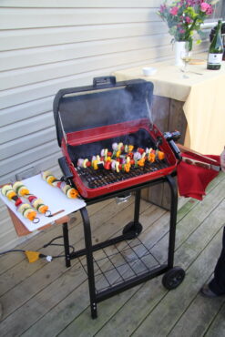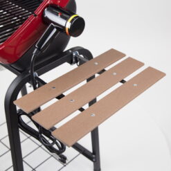This great electric grill is easy to move and has lots of great features! The Meco Americana Deluxe Electric Cart Grill has 200 square inches of usable cooking surface, thermostatic controls, and variable 1500-watt, UL-listed heating element specifically designed for barbecuing. There are three element positions including vertical for various cooking styles and indirect rotisserie cooking. Grill features an on/off light, heat saving reflector pan for even cooking, and a handy grease pan. This sturdy cart has square-tube legs, handy, fold-away composite wood side tables, a sturdy wire lower shelf and it is safe for outdoor cooking. The hood and bowl are pre-assembled. Standard 120-volt grounded plug.