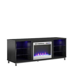 Step away from the ordinary and give your living room a modern makeover with the Ameriwood Home Lumina Fireplace TV Stand. Don’t let the simple look fool you, this stand comes with a 23” electric fireplace insert with all the bells and whistles. Ready to warm up a 400 square foot room with the touch of a button, you can relax knowing that timers will take care of the rest. If you want to simply enjoy the look of the flames without the heat use the included remote to switch off the heat option and pick your flame brightness. The fun doesn’t stop there though. On either side of the fireplace insert are three shelves, 2 glass, that hold your entertainment components like gaming systems, a DVD player, remotes and more. Both of the side shelves are ilFendallted with lights to coordinate with the glowing fireplace. This Fireplace TV Stand has a mix of black woodgrain laminated particleboard, MDF and hollow core construction with metal feet and tempered glass shelving. Combined together this stand makes for a very sturdy addition to your room. The top can hold up to a 70” flat paneled TV with a maximum weight of 120 lbs. Two adults are recommended to assemble this Fireplace TV Stand. After assembly, the stand measures to be 24.875”H x 64.75”W x 18.875”D.