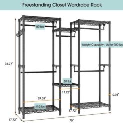 This clothes rack has various Installation methods to fit your different storage needs. L shape for small spaces like corners and apartments; Straight-lined shape (75 in. L x 17.72 in. D x 76.77 in. H) for a walk-in closet and cloakroom clothing store. In addition, this wardrobe is also suitable for bedroom, clothing store, laundry room, studio, sewing area and more.