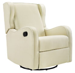 The Angel Line Rebecca Upholstered Swivel Gliding Recliner will help complete your nursery. After full assembly, it has a metal base that allows for both 360-degree swivel and smooth gliding functions. The easy pull lever mechanism on the right side of the swivel recliner chair armrest releases the leg rest so you can prop your legs up and fully recline the unit for comfort and relaxation. Calm your baby and soothe them to sleep in comfort and with ease. Though mainly constructed for nursery use, this recliner will easily fit well in any room in the house from the den to the basement. The neutral scheme of the beige fabric glider recliner chair will match most decorative home palettes and make for a welcome addition to your home furniture.