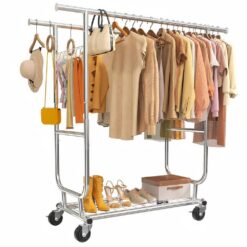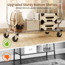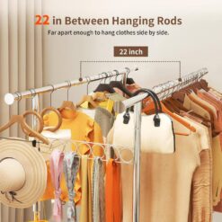 In the hustle-bustle of daily life, an organized storage solution is key. Our Heavy-Duty Clothes Rack is here to transform your space with its remarkable features.With a hefty 620LBS load-bearing capacity, this rack is built to last. Made of heavy-duty steel with an electro-plated finish, it resists rust, corrosion, and scratches. The double hanging rods can hold 400 LBS, while the bottom shelves bear 220 lbs. This rack is a multi-functional wonder. It combines clothing, shoes, scarf, hat, and umbrella storage. Ideal for decluttering bedrooms and dormitories, it’s also great for commercial use, such as store displays and laundry rooms. meeting all your storage needs.Its adjustable design sets it apart. Four height-adjustable metal tubes (42 in. L x 22 in. W x 68 in.H) allow you to customize the height on both sides. This provides three times more space than a regular single-pole rack, perfect for clothes of all sizes.Assembly is a breeze. Clear instructions and tools mean you can put it together or take it apart in just 15-minutes. There are even complimentary gloves for your convenience. When not in use, its folding design helps save space. 4-360° movable wheels ensure smooth movement across any floor, whether in your bedroom, dorm, or store. 2-lockable casters (diagonal mounting recommended) keep it stable and ensure safety.