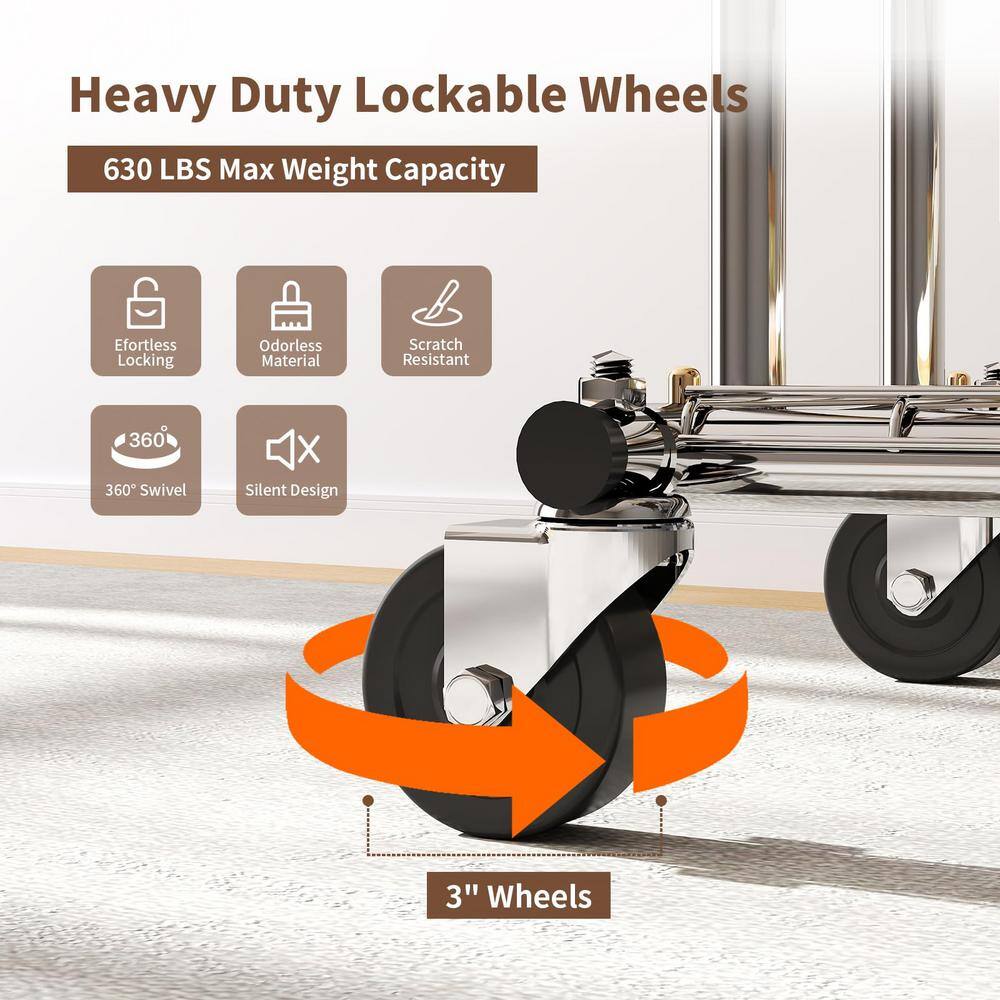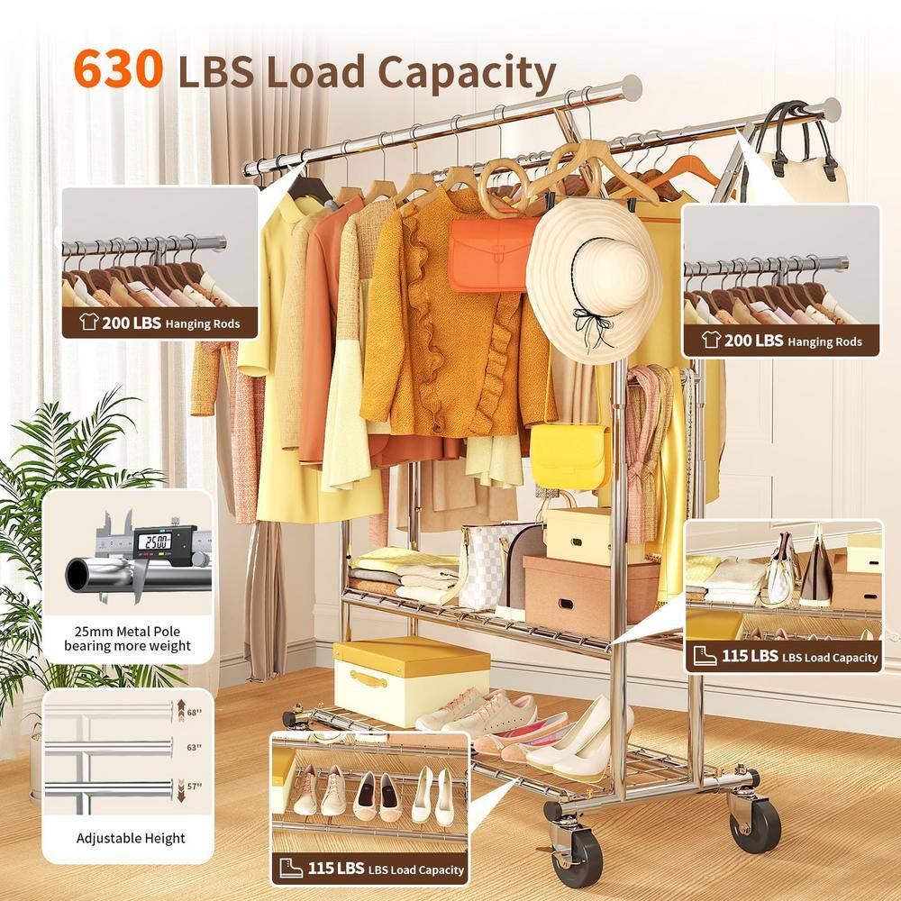 - Our heavy – duty clothes rack offers an impressive 620 lbs. load – bearing built with high – quality heavy – duty steel and electro – plated, it resists rust, corrosion, and scratches the double rods hold 400 lbs. and bottom shelves bear 220 lbs. handling heavy items effortlessly