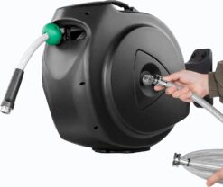 - [Lock and Automatic Rewind Operation]: Easy operate at far place- The hose can be locked at desired length by pulling it. A short tug could unlock the hose to let it retract all the way back smoothly and nicely.