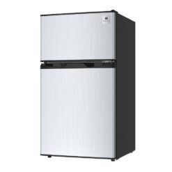 This double-door Mini Refrigerator with top freezer includes plenty of storage space for your fresh and frozen foods. Glass shelves, crisper drawer and built-in can dispenser keeps your food organized and within easy reach. A stainless steel cabinet provides a sleek contemporary look that will easily compliment any decor.