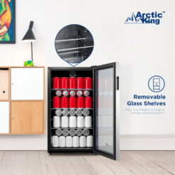 “Enjoy chilled canned beverages anytime with the Arctic King 115-Can Beverage Fridge & Cooler. This premium beverage cooler features a clean stainless steel frame that gives you plenty of cooling capacity for parties and special occasions. This beverage cooler offers plenty of storage to keep up to 115 355ml cans cold. It features a simple design with a recessed handle for practicality. The door is a see-through tempered low-E glass door that showcases the drinks inside the cooler for style and aesthetic. It also has an adjustable leg for stability. This compact electric beverage cooler can fit in smaller areas, corners, or spaces. It will look great in your home, apartment, studio office, and even your garage. This beverage cooler has a sleek and modern exterior which offers a versatile look that will work great with any office or home style or decor. Keep your drinks chilled and cool anytime and enjoy a cold drink anytime you want. Its capacity to hold up to 115 cans makes it a great piece to keep you prepared and stocked with chilled drinks during your next party. ”