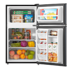 The Arctic King 3.2 cu ft Two-Door Compact Refrigerator is an excellent way to keep your food and drinks cold in any sized room. The separate freezer compartment gives you plenty of space to store your frozen dinners, ice cream and more. The can dispenser and two-liter bottle rack free up shelf space and make your favorite drinks easily accessible. The stylish stainless steel look will suit all styles of decor and the interior light makes it easy to find your favorite treats. Use the mini fridge in your den, garage, office or dorm room, and it can easily fit in a tight corner or other out-of-the way place. Arctic King 3.2 cu ft 2-Door Compact Refrigerator not only keeps your favorite food perfectly fresh for longer, but its manual defrost setting allows you to clean whenever you want for optimal cooling and food preservation. Easily set the internal temperature according to your needs, and simply adjust the leg height as this compact cooler fits perfectly in any kitchen.